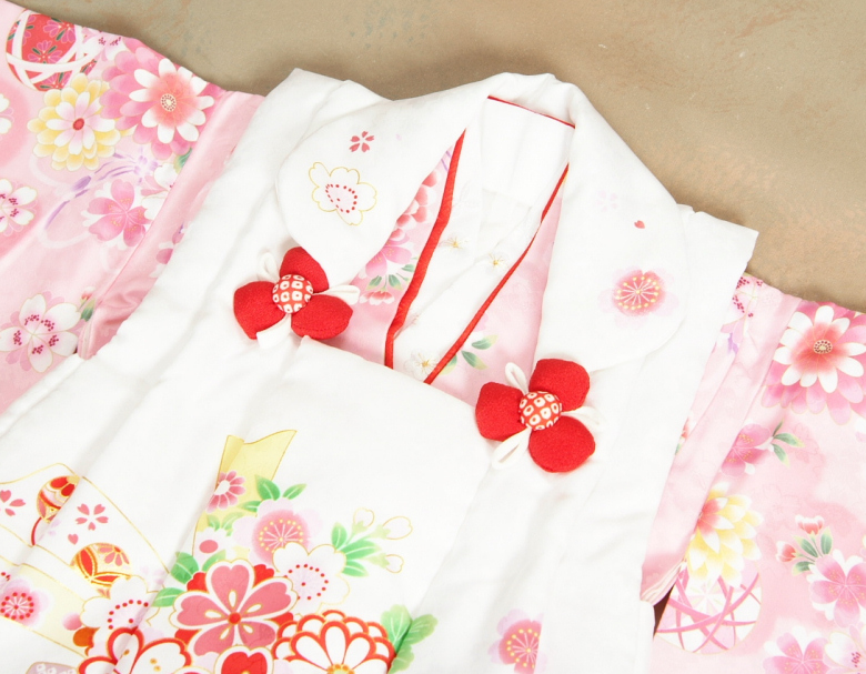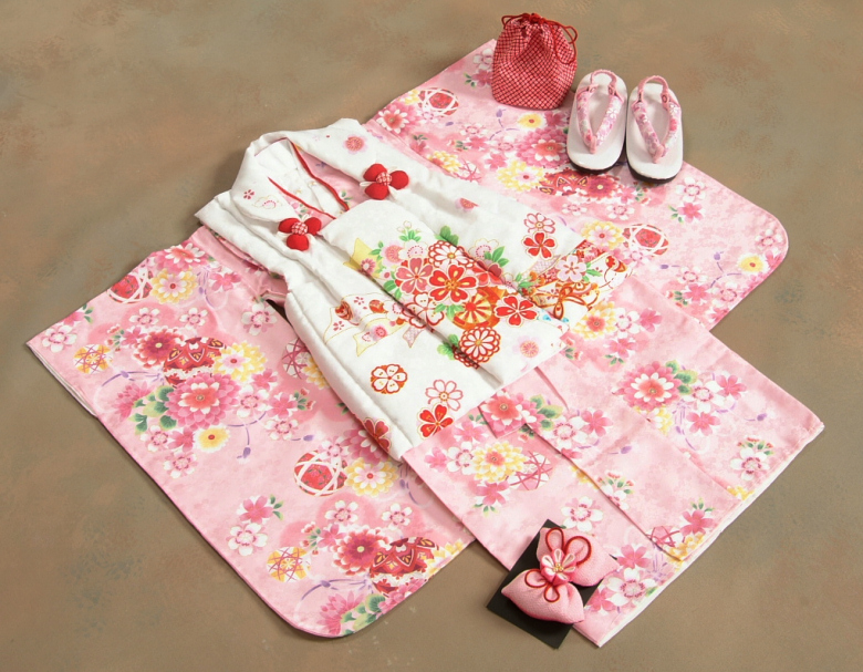 【送料無料】可愛らしいピンク地の着物に白色の熨斗花車模様が雅な「京都花ひめブランド」の七五三着物3歳被布セットです。