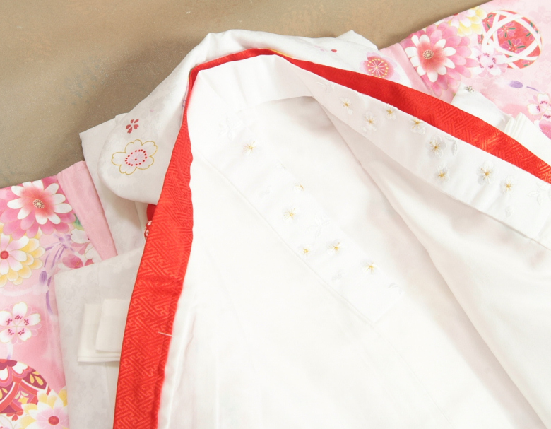 御着物には重ね衿、長襦袢には白梅桜刺繍をあしらった半衿も初めから縫い付けてあり、面倒な肩上げや腰上げも初めからしてある楽々仕様です。