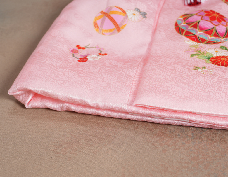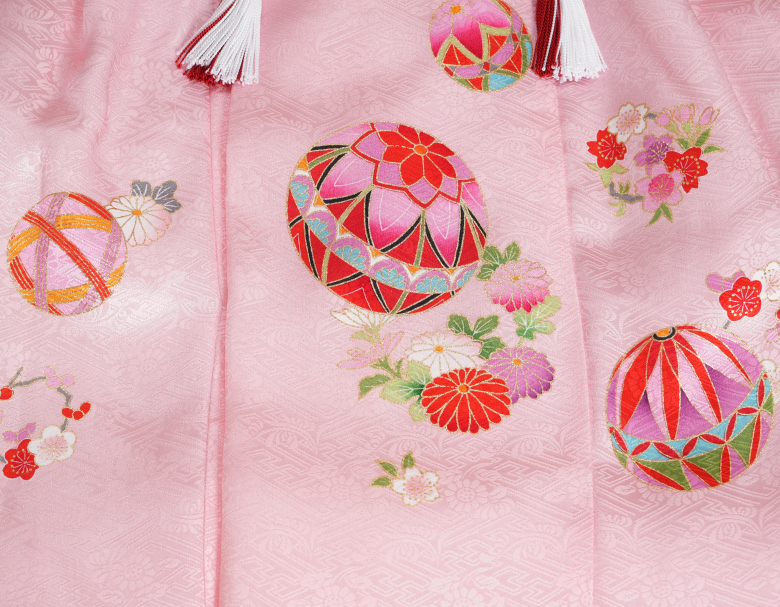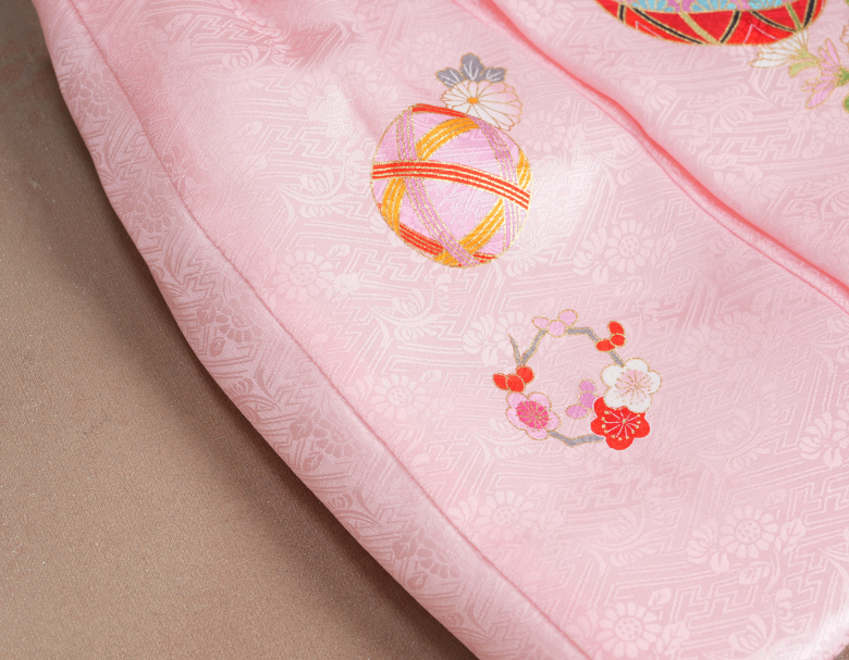 御着物の色目は可愛らしいピンク地色でまりや菊、梅、桜などの落ち着きのある古典柄になります。