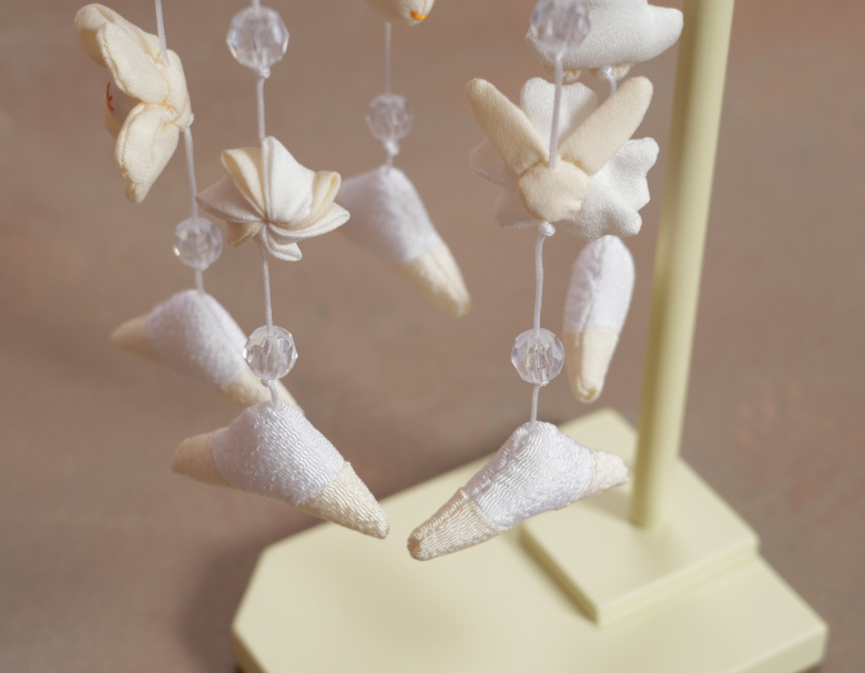 おめでたいの鯛や長寿の象徴である鶴、美の象徴である桜などのモチーフにクリスタル、友禅柄の飾り傘が付いた可愛らしい吊るし飾りになります。