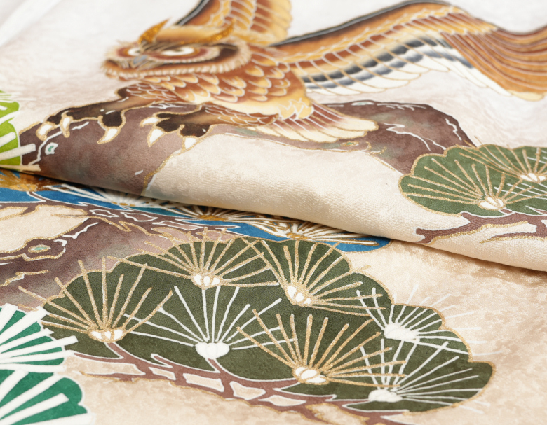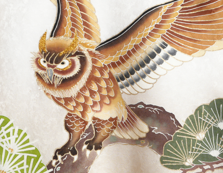 メインの柄のミミズク(梟)の耳部分には金糸刺繍が入り柄の要所に入った金彩の箔と合わさり上品な豪華さがあります。