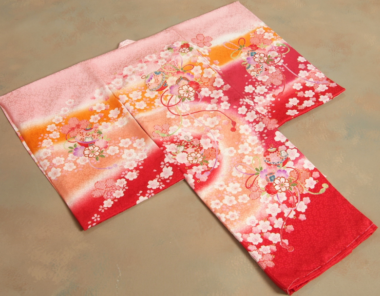はっきりとした色合いのピンク色や淡いピンク色の濃淡グラデーションに裾赤色の染分けが御着物の色目に深みを与えてくれます。