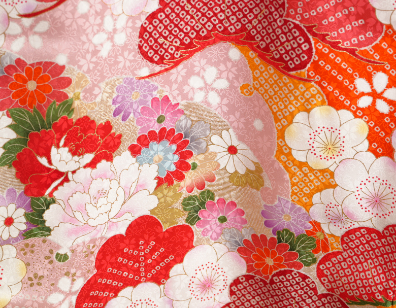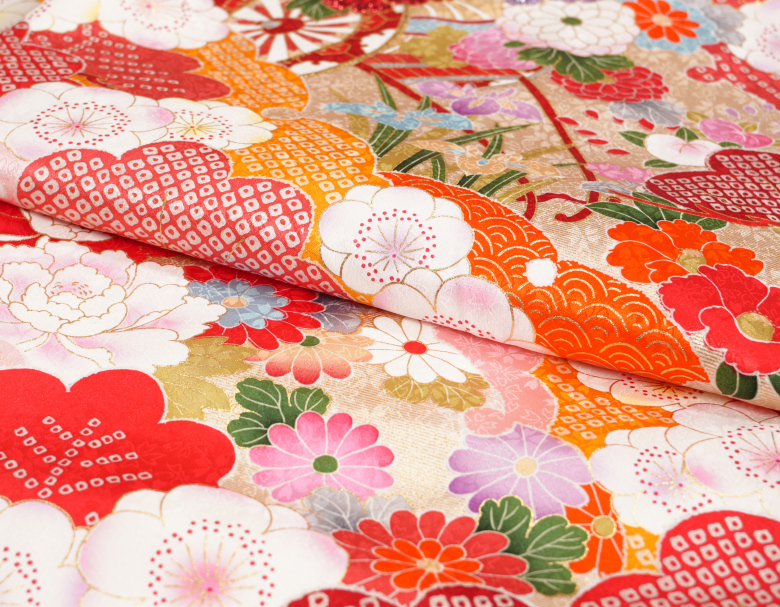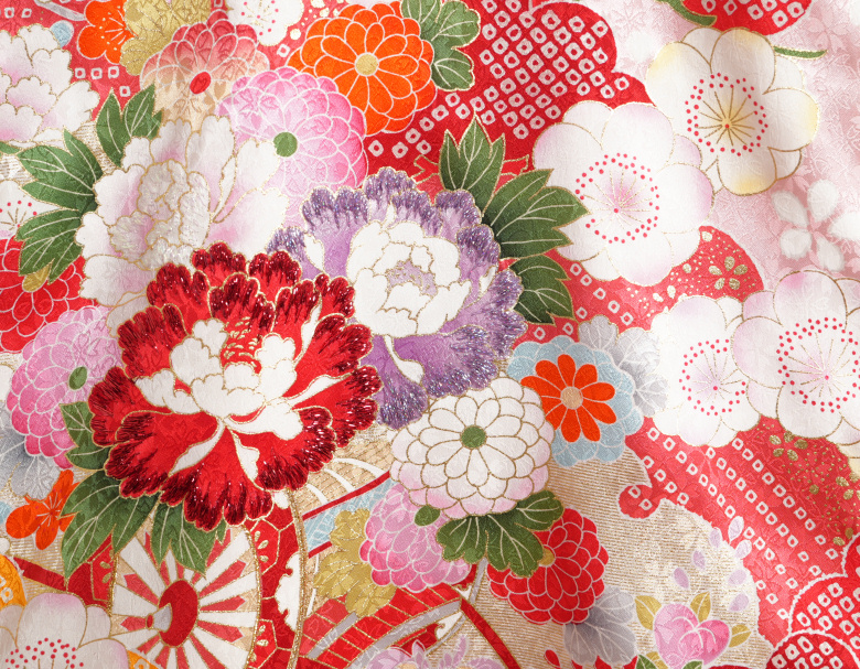 柄の華の色目が濃淡で染め分けられた「桃山配色」という特徴のある染められかたをしてあります。