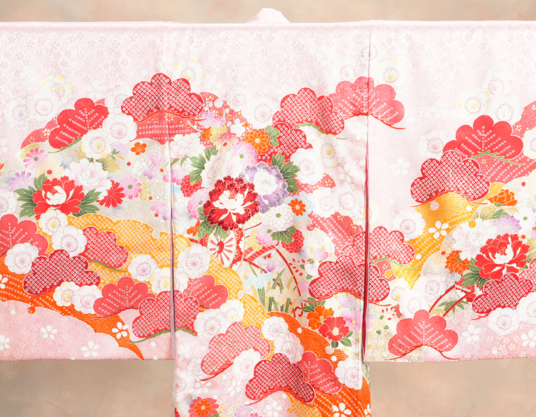 古典縁起柄の花車を中心に菊や牡丹、梅、椿、松などの華々が入り全体を雲取の染め分けで彩った華やかさのある柄配色になります。