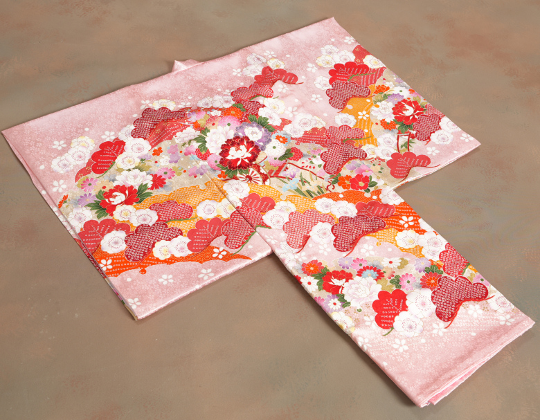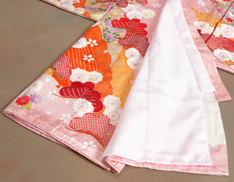 御着物生地は桜の文様が織り込まれた地紋生地になり絹生地特有の光沢感が御着物全体にある正絹綸子生地を使用していますのでしなやかでコシのある生地感です。