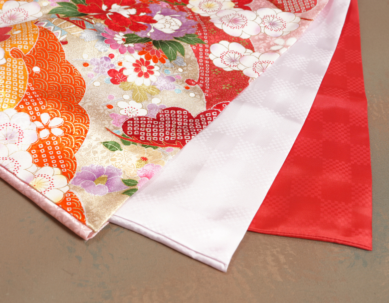 御着物と長襦袢の前身頃には初めから紐も縫い付けてありお宮参り着物に合わせた長襦袢もセットで御付けいたしますので仕付け糸を解いて頂ければすぐに使えます。