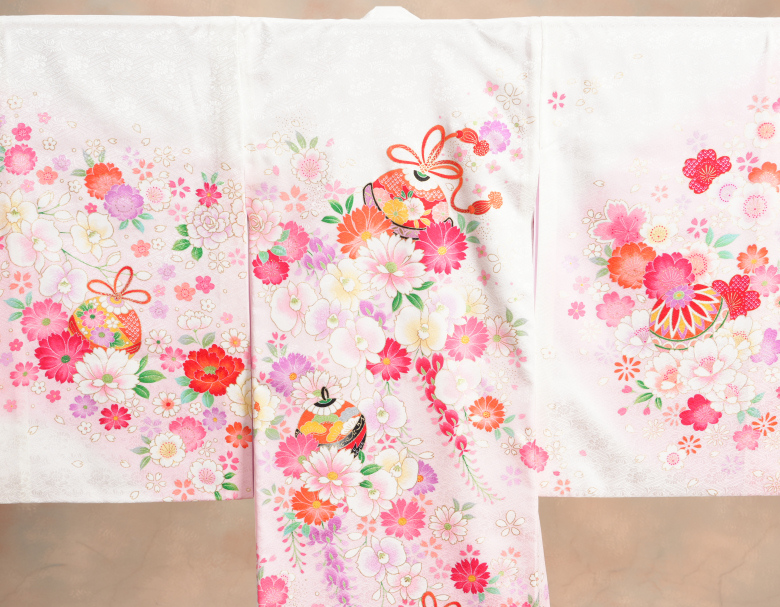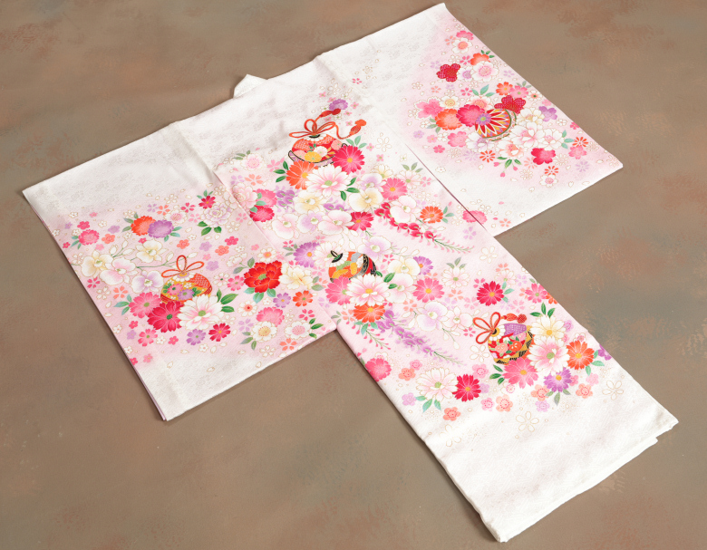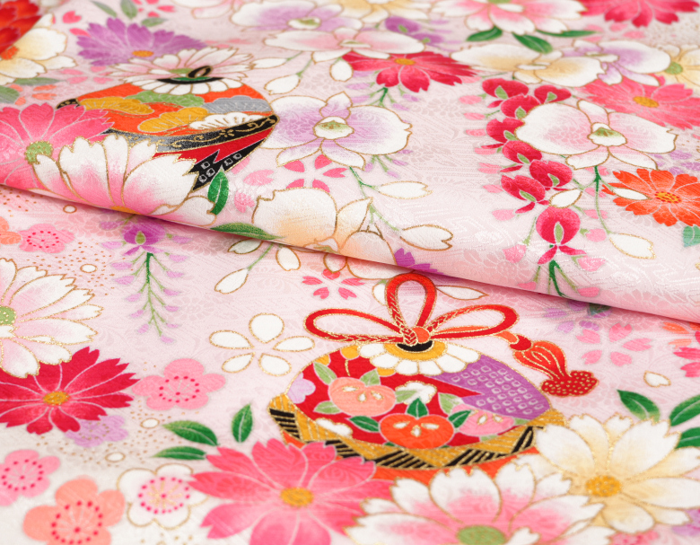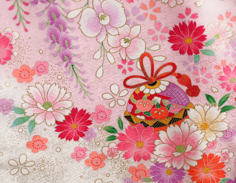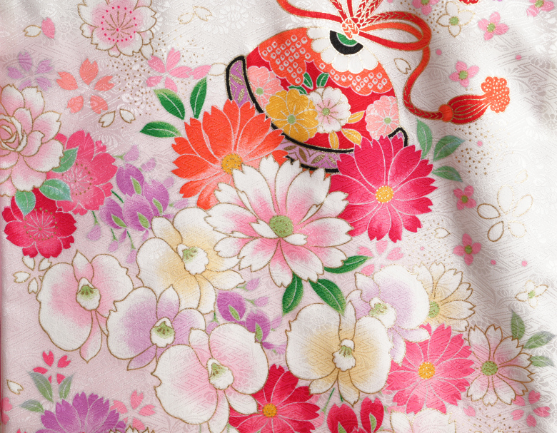 柄域は鈴を中心に八重桜や胡蝶蘭、牡丹、梅などの華花が御着物全体を彩る華やか柄域になります。