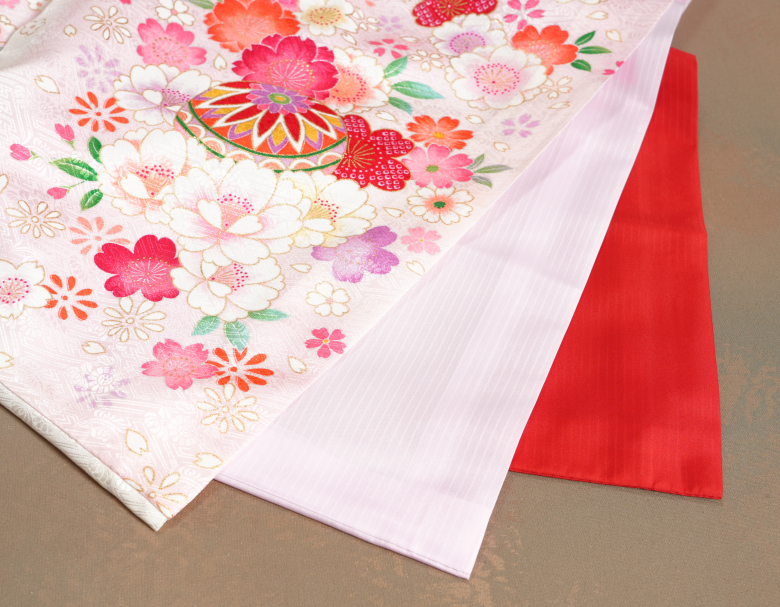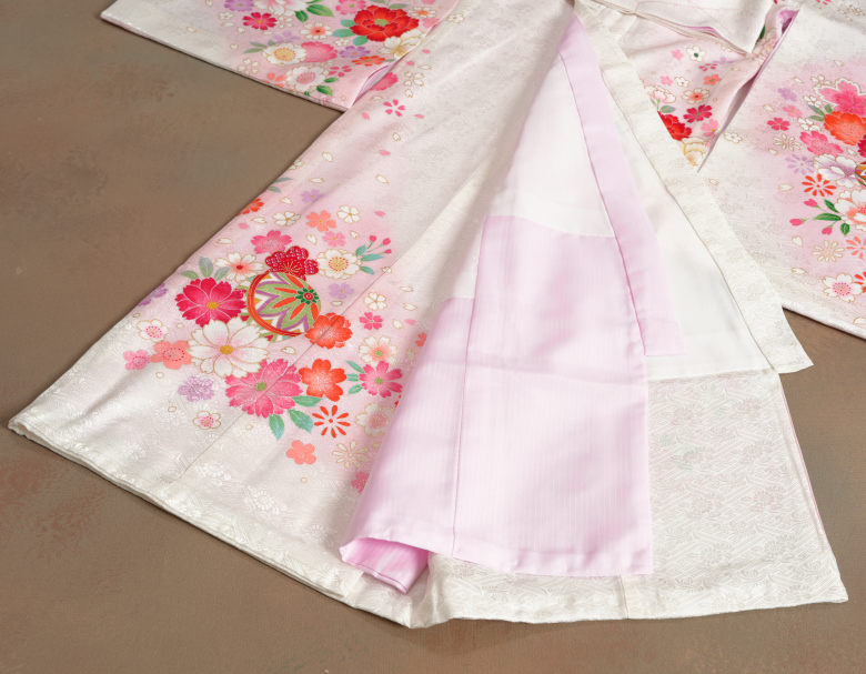 中に重ねてある長襦袢がピンク色になりますので表地に薄っすらと淡いピンク色が出て柔らかみのある色合いになっているのも可愛らしいですね。