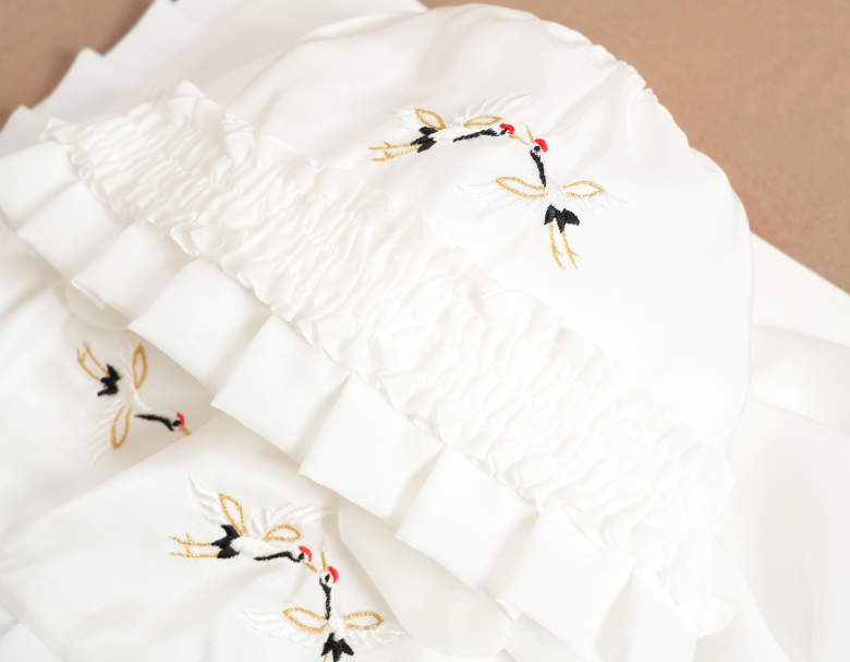 涎掛けのスタイとお帽子のフードには飛翔鶴の刺繍があしらってあり、お帽子のフードにはレースがあしらってあります。