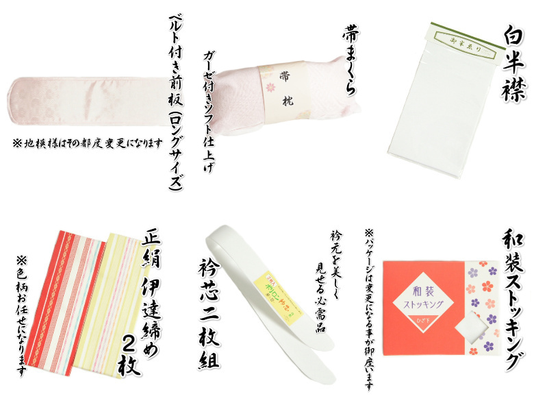 | 商品内容 | 正絹伊達締め2本 帯枕 ウエストベルト コーリンベルト トリプル仮紐 衿芯2枚 ベルト付き前板 後板 白半襟 正絹腰紐3本 モスリン腰紐3本 和装ストッキング 着物ハンガー 和装スリップ キルティングバッグ |